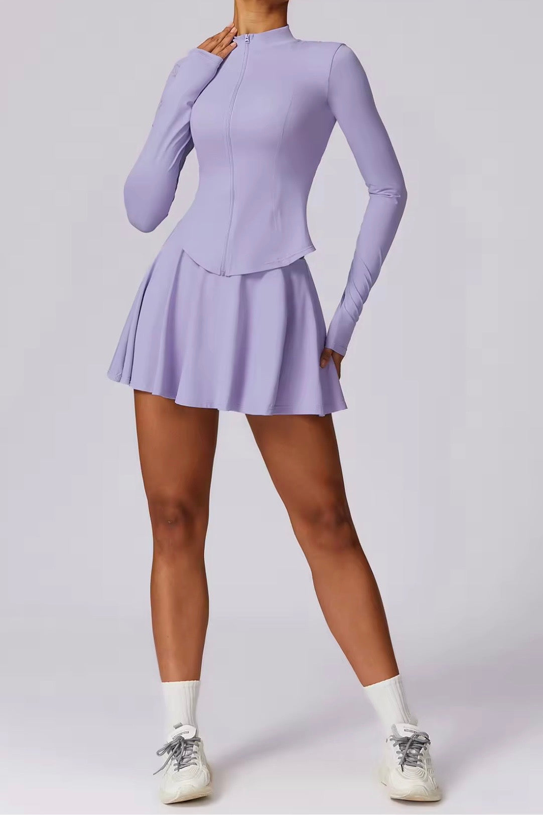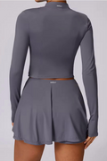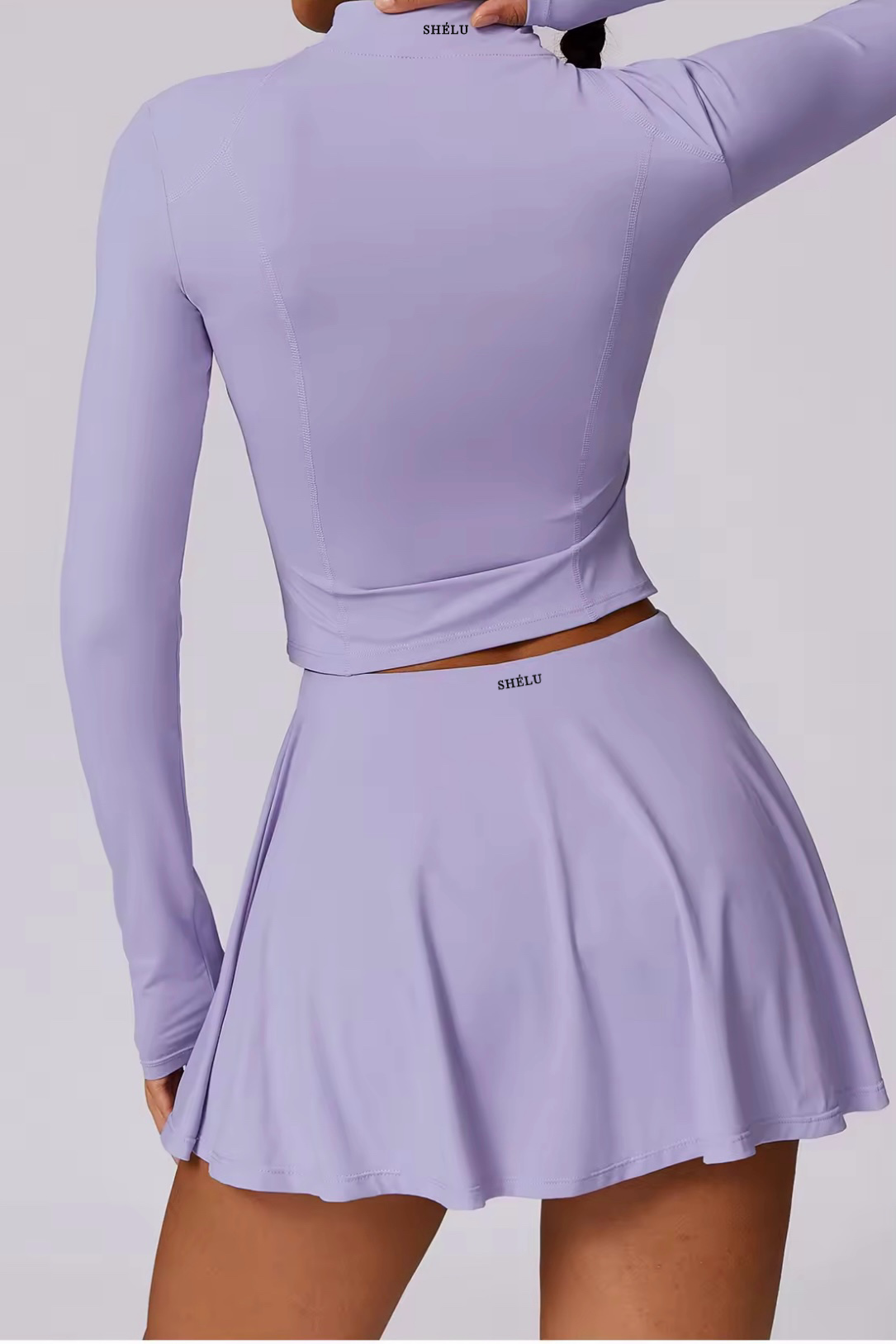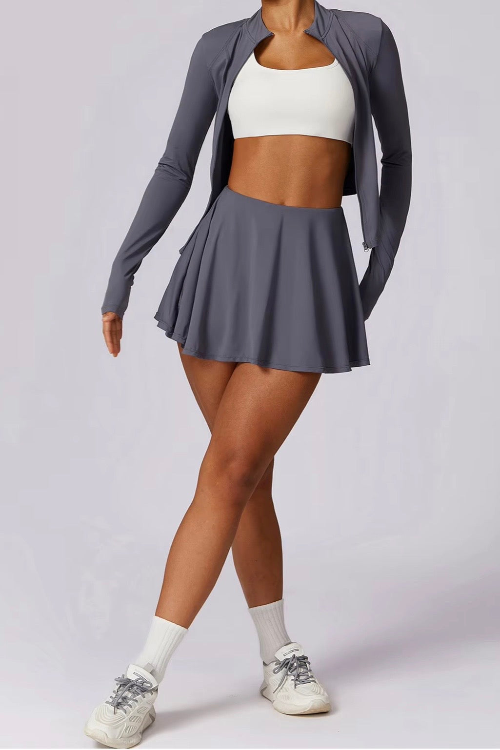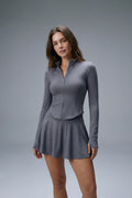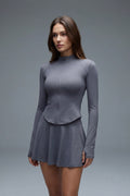 The Vyra Set is defined by movement and structure in perfect balance. The fitted upper silhouette shapes the body with clean lines, while the softly flowing skirt creates lightness with every step. Designed to feel effortless yet intentional, it blends sport-inspired precision with feminine elegance.